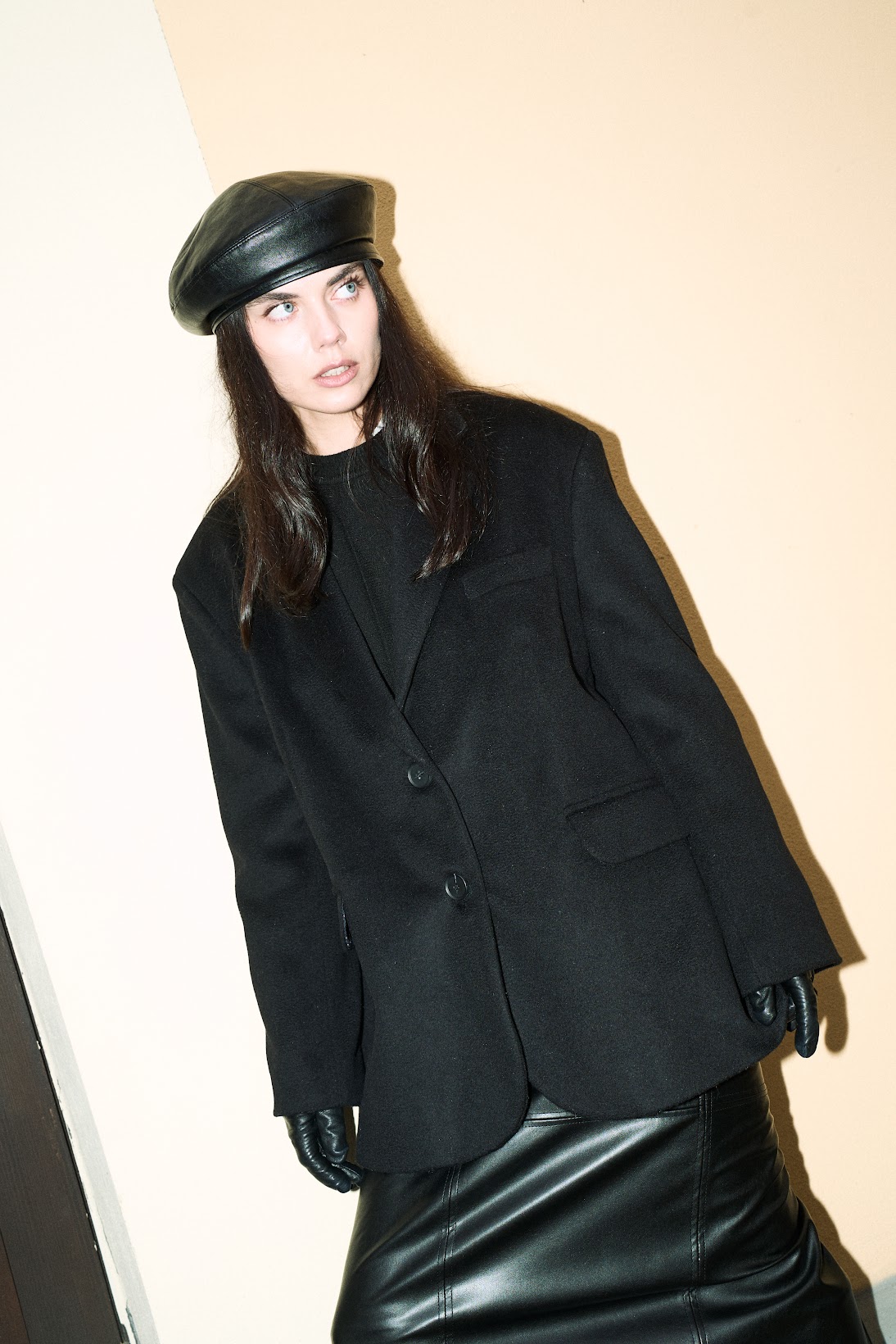 Жакет- полупальто свободного прямого силуэта с мягкой, спущенной линией плеча и двумя шлицами в трендовой фактуре сезона