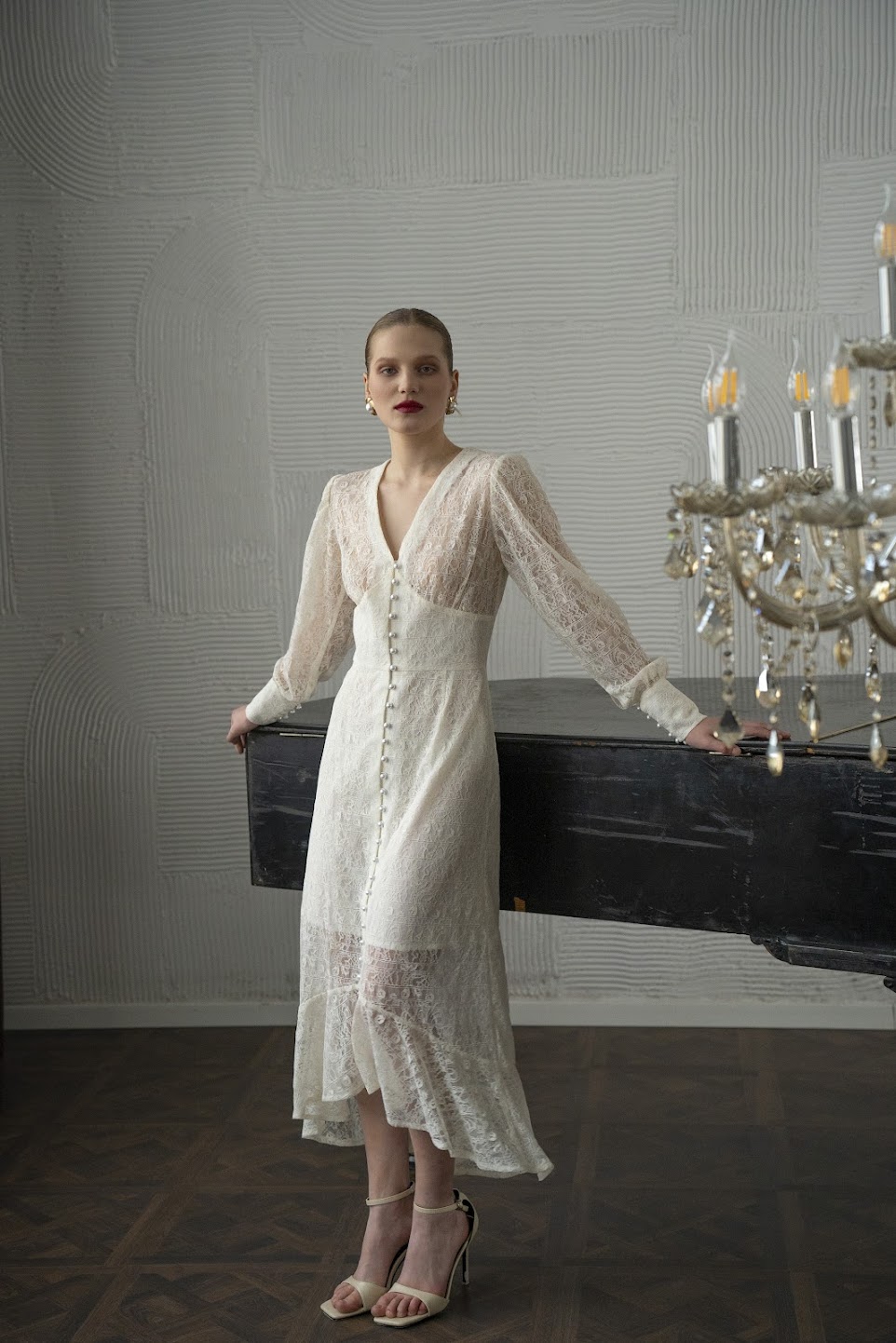 Благородное итальянское кружево расскрывается в безупречном классическом силуэте с корсетным лифом и акцентными высокими манжетами, декорированными десятками жемчужин.