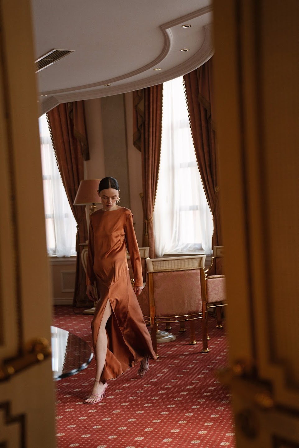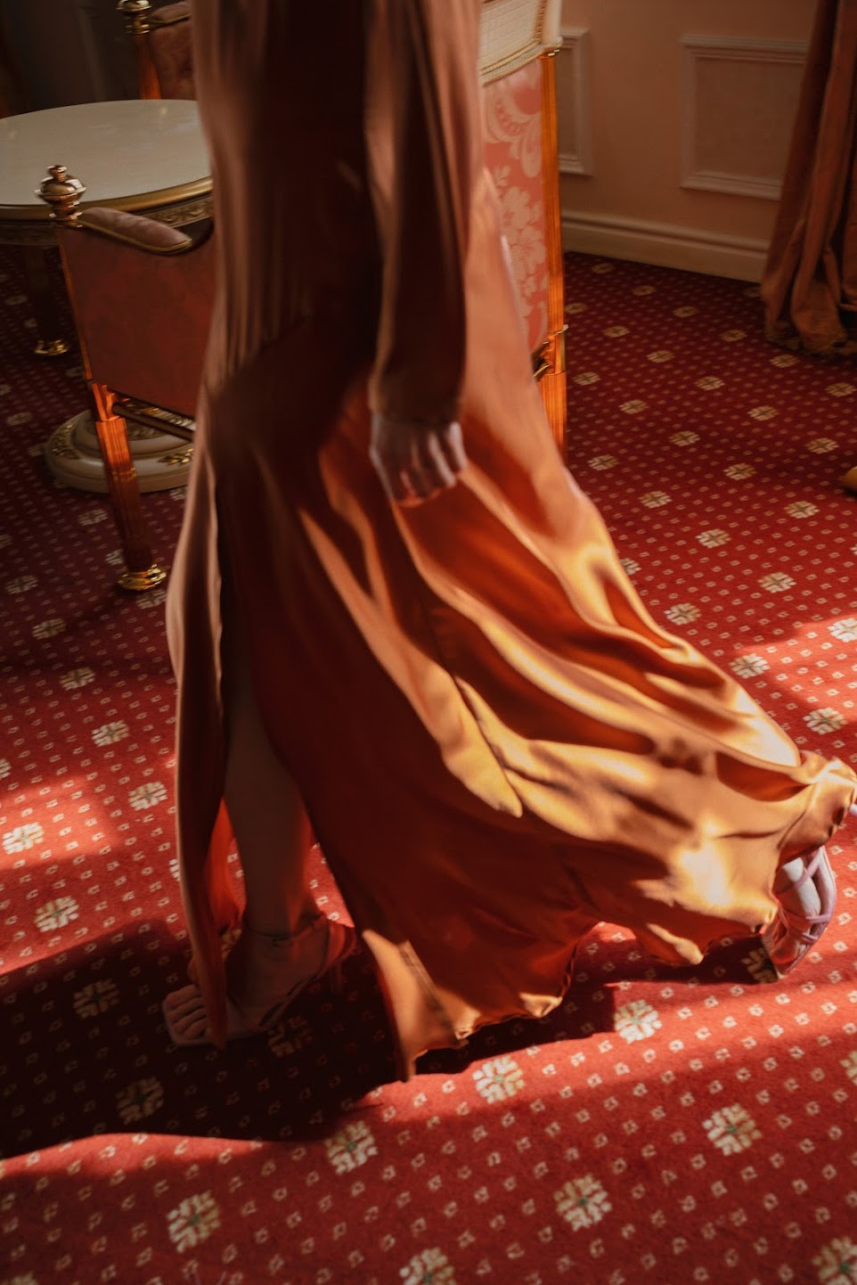 Платье с высоким разрезом в длине макси из шелковой итальянской ткани люкс класса комплиментарного А - силуэта с кроем по косой.