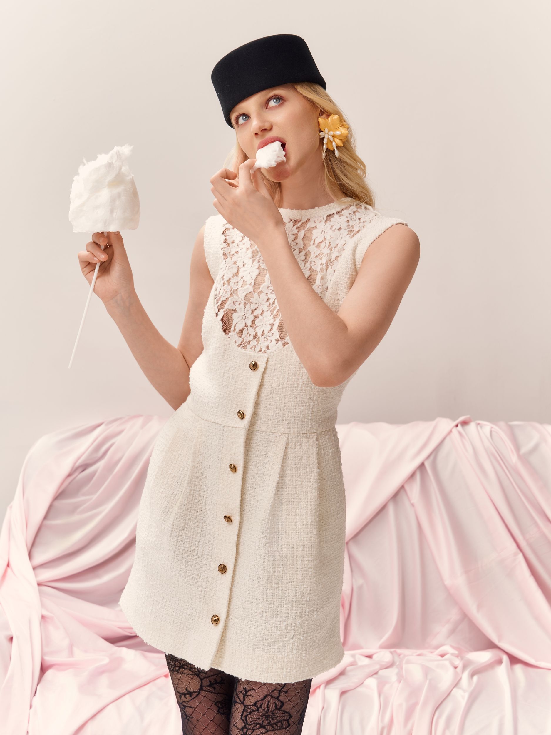 Модель выполнена в приталенном силуэте и представлена в трендовом молочном оттенке PANTONE 11-0608 Coconut Milk, который подчёркивает утончённость и свежесть образа.