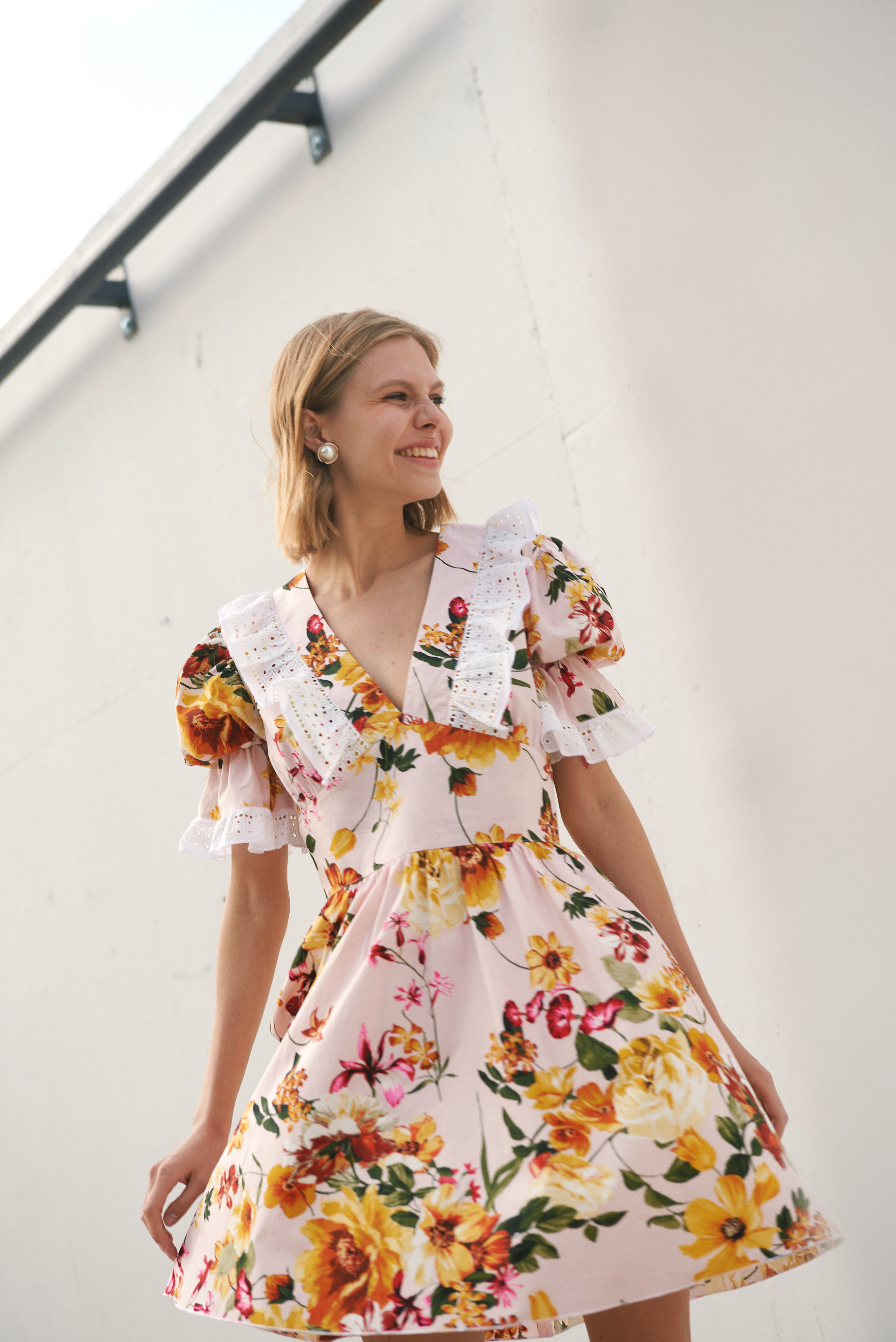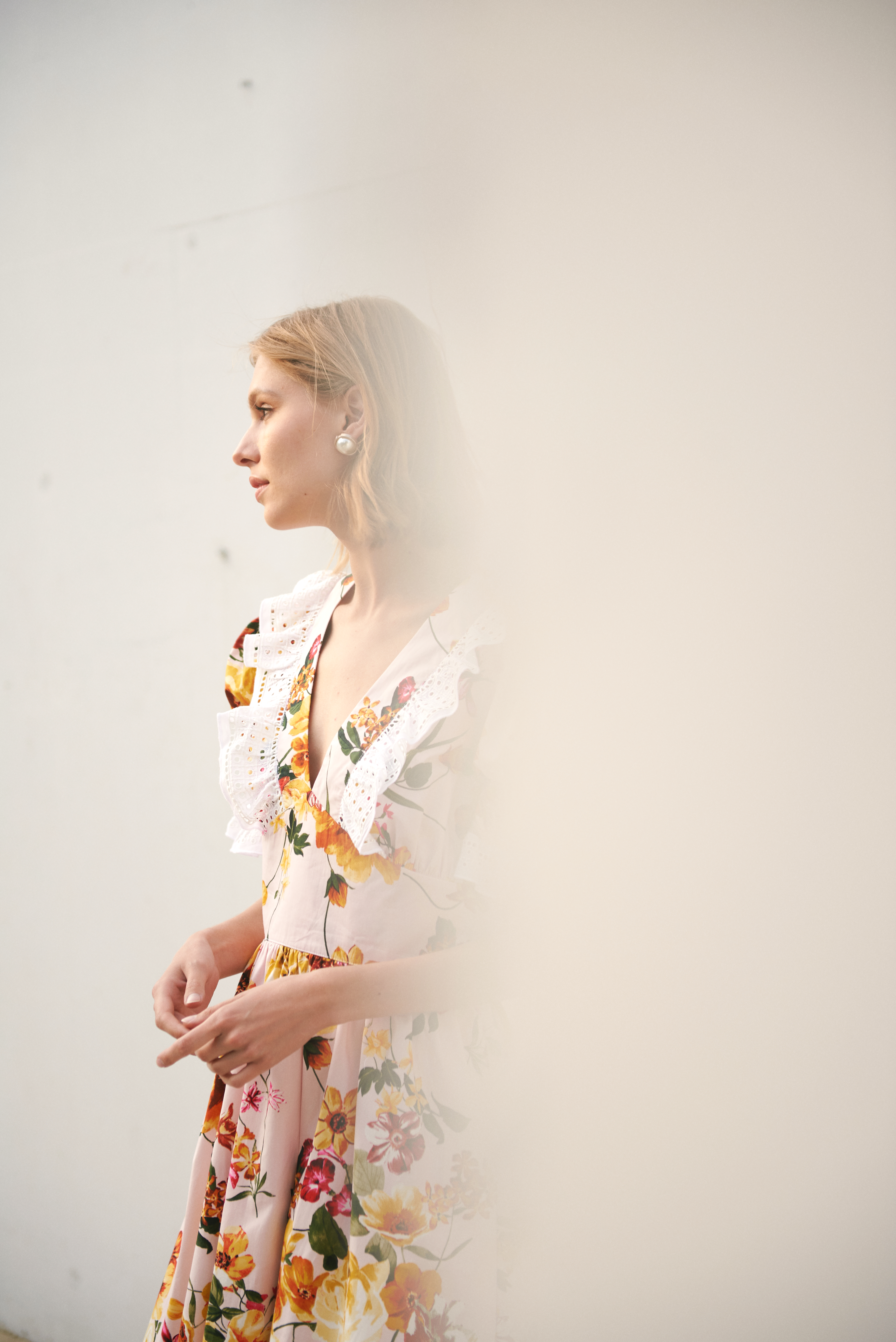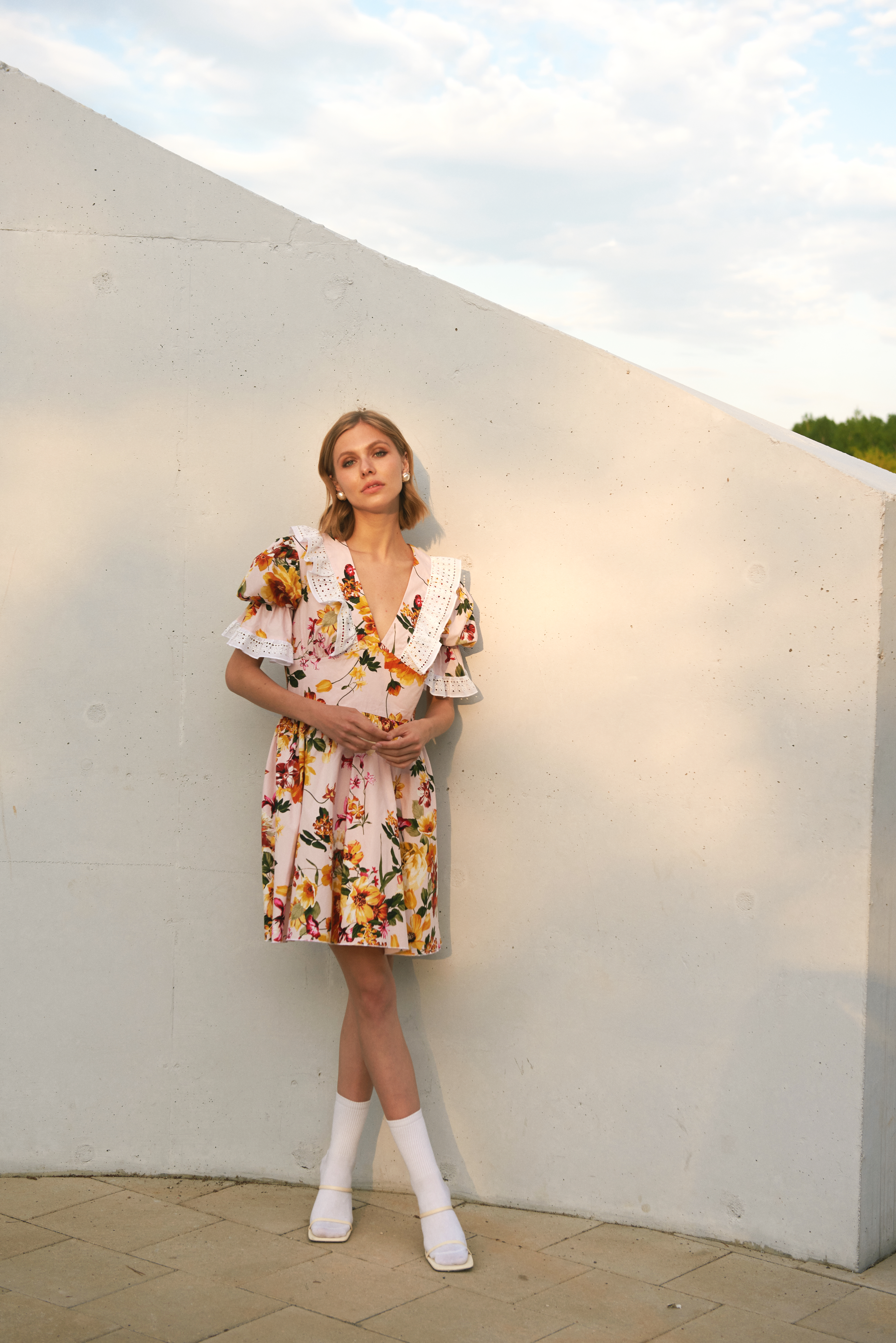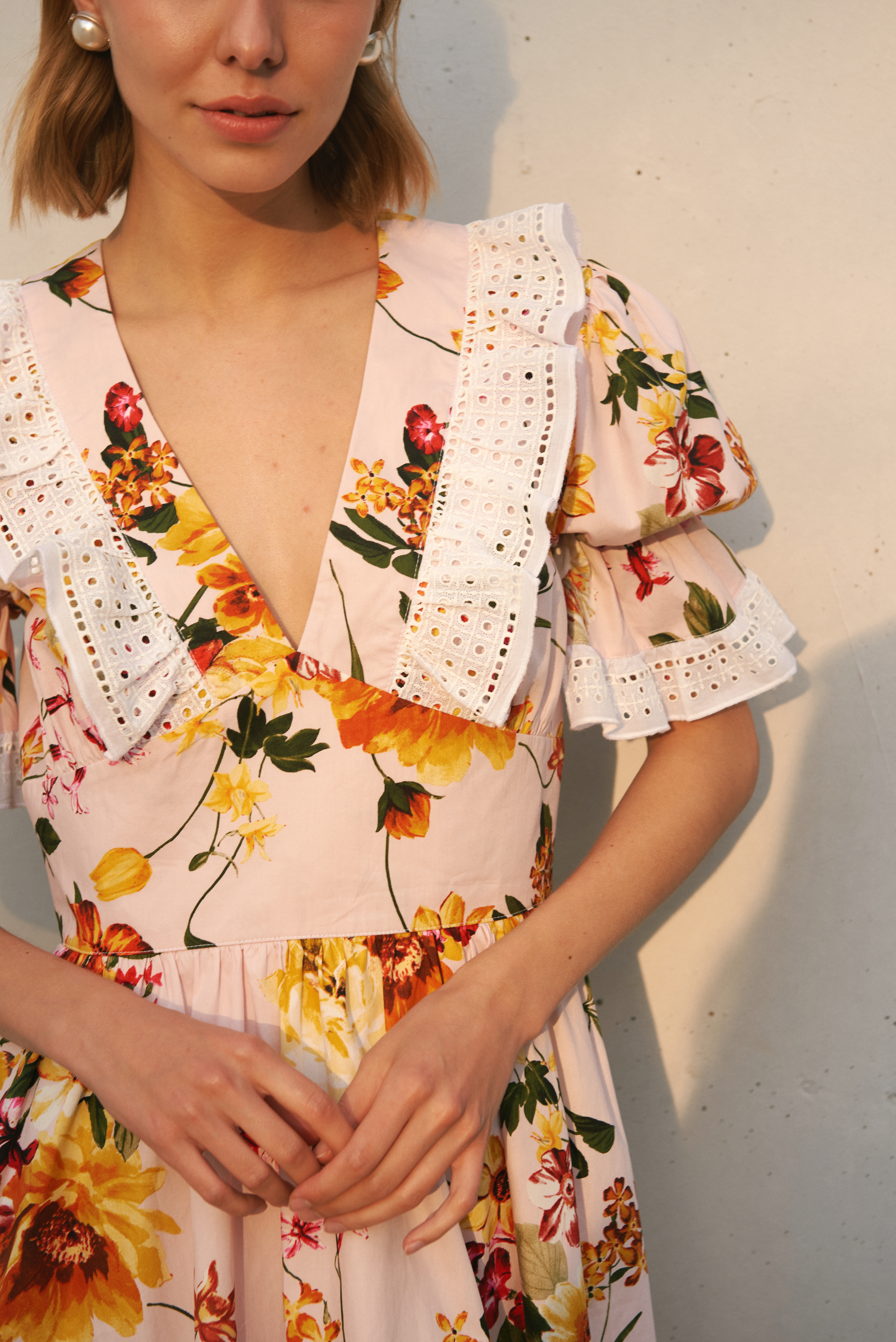 Россыпь эксклюзивного цветочного принта на невесомом итальянском хлопке в любимой модели платья, декорированной шитьем.