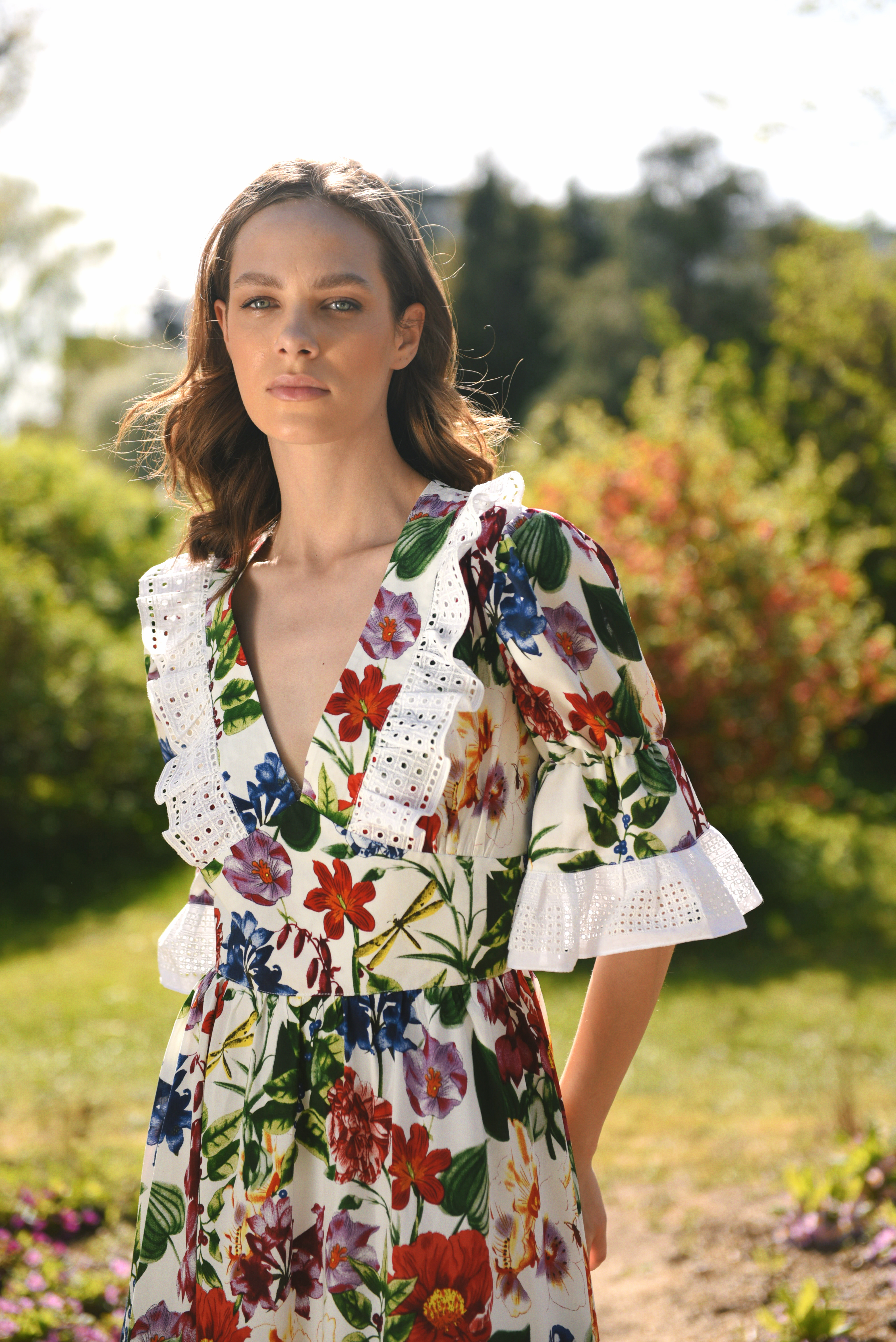 Россыпь эксклюзивного цветочного принта на невесомом итальянском хлопке в любимой модели платья, декорированной шитьем.