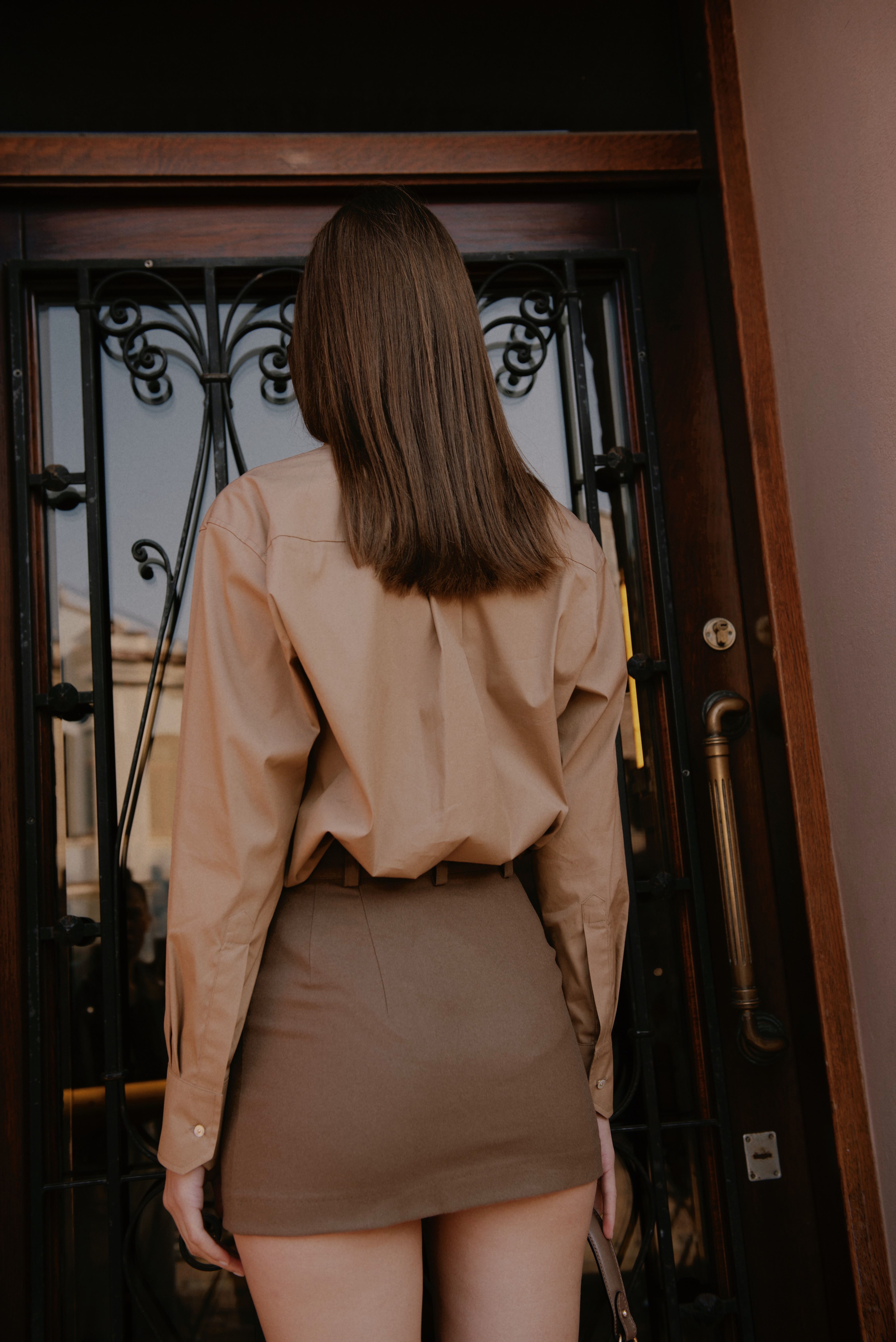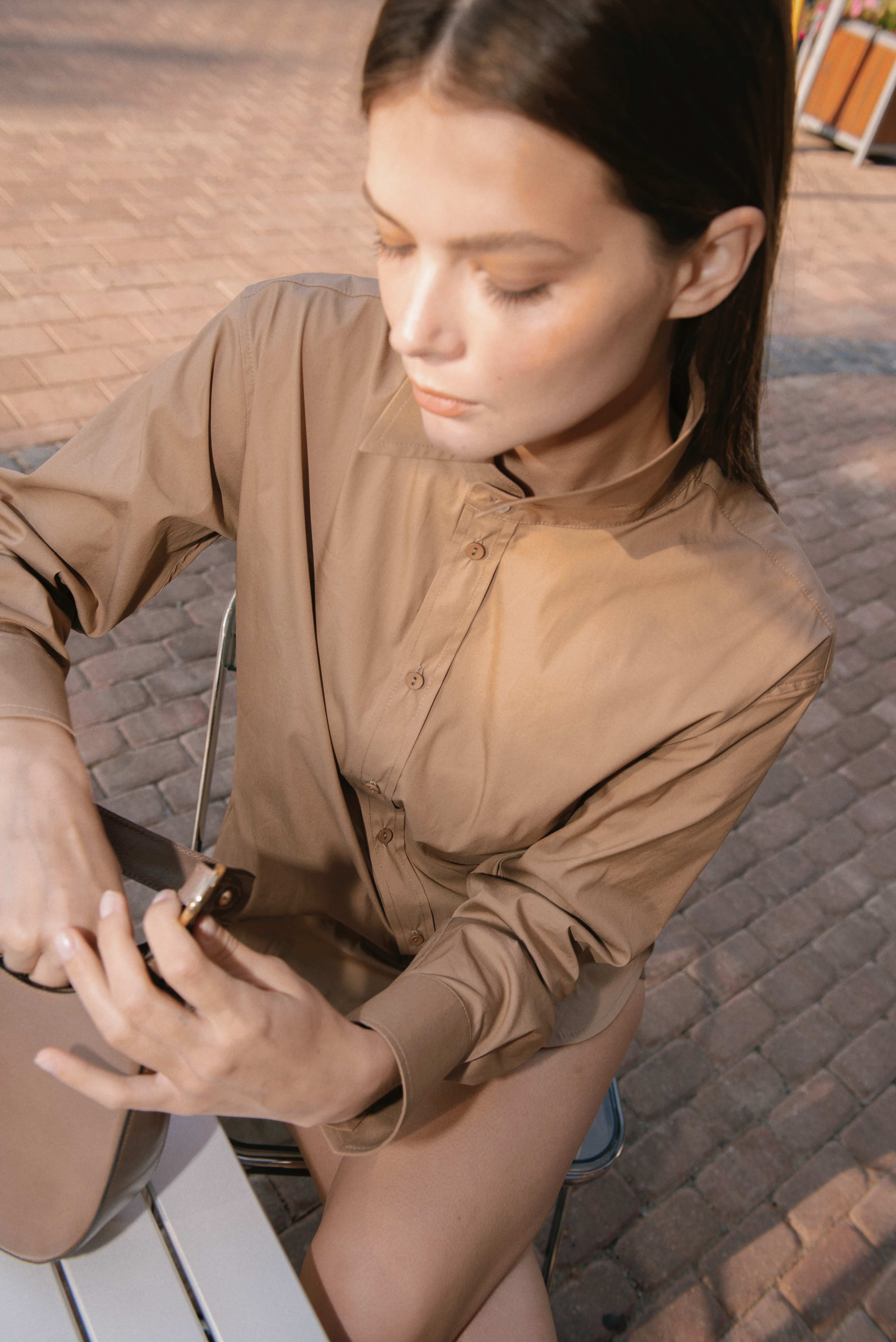 Новый силуэт рубашек со сложными фигурными манжетами и двойной кокеткой, закрытым швом и декоративными акцентными пуговицами с натуральным перламутром. Итальянский шлифованный хлопок.