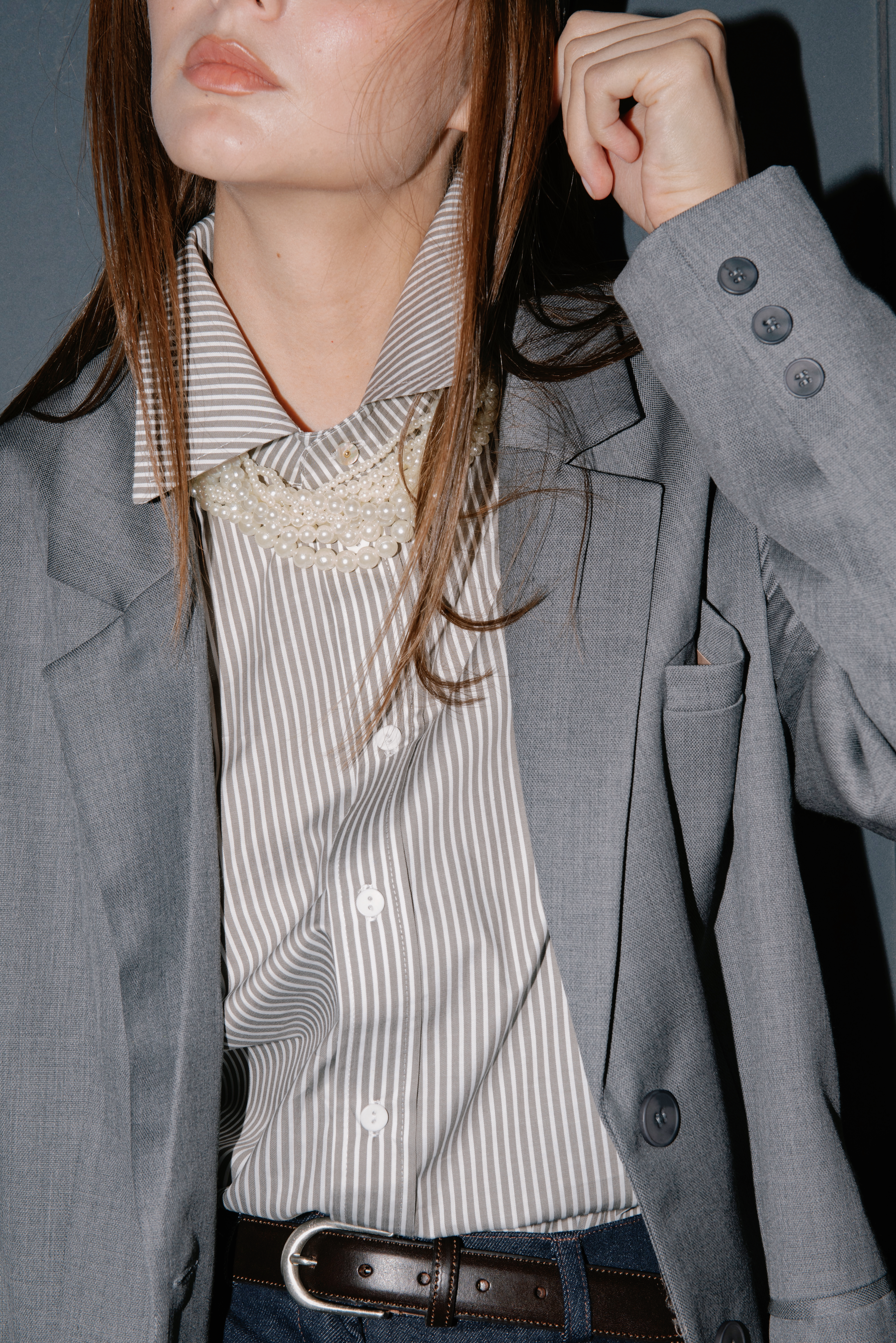 Новый силуэт рубашек со сложными фигурными манжетами и двойной кокеткой, закрытым швом и декоративными акцентными пуговицами с натуральным перламутром. Итальянский шлифованный хлопок.