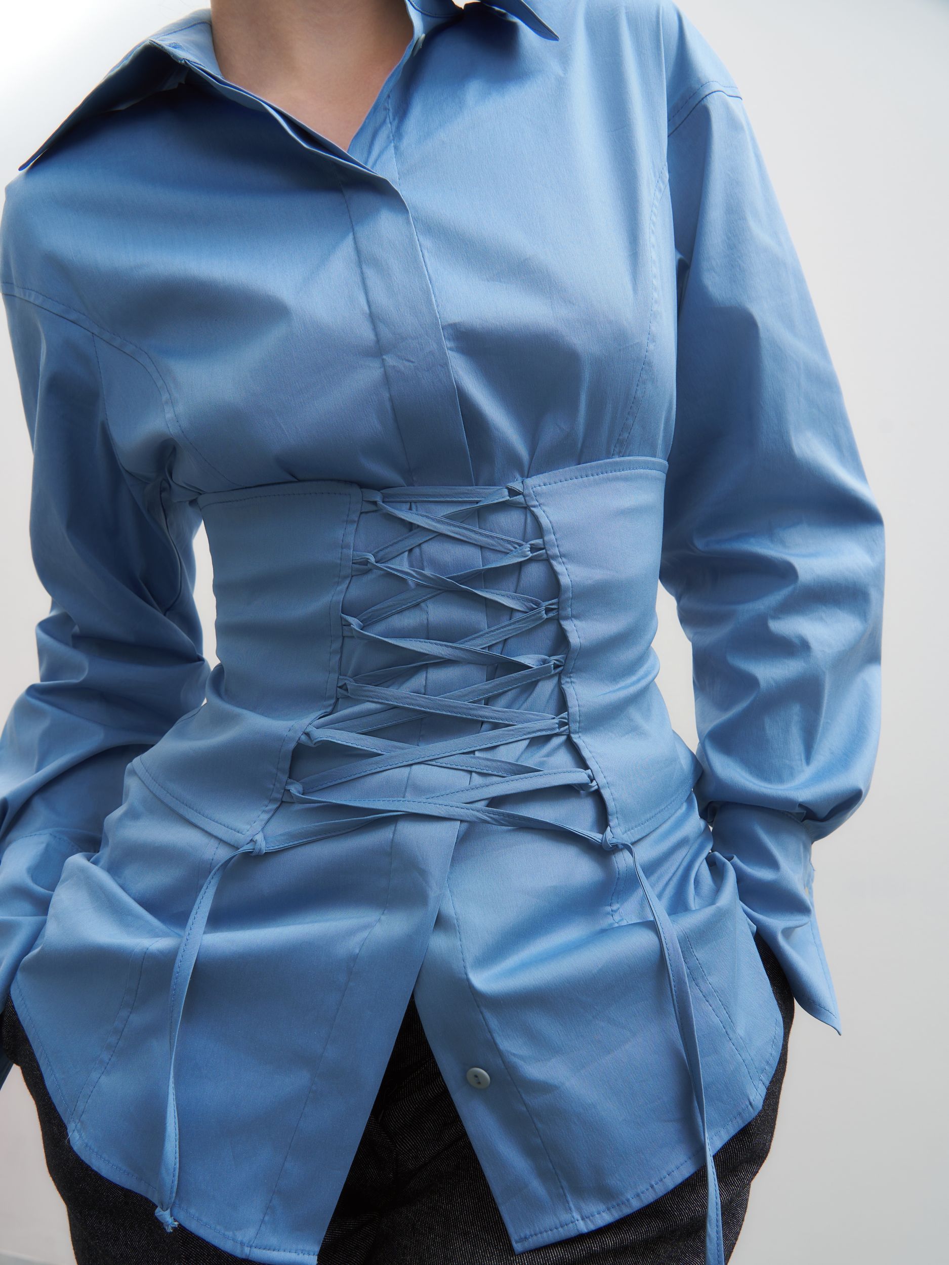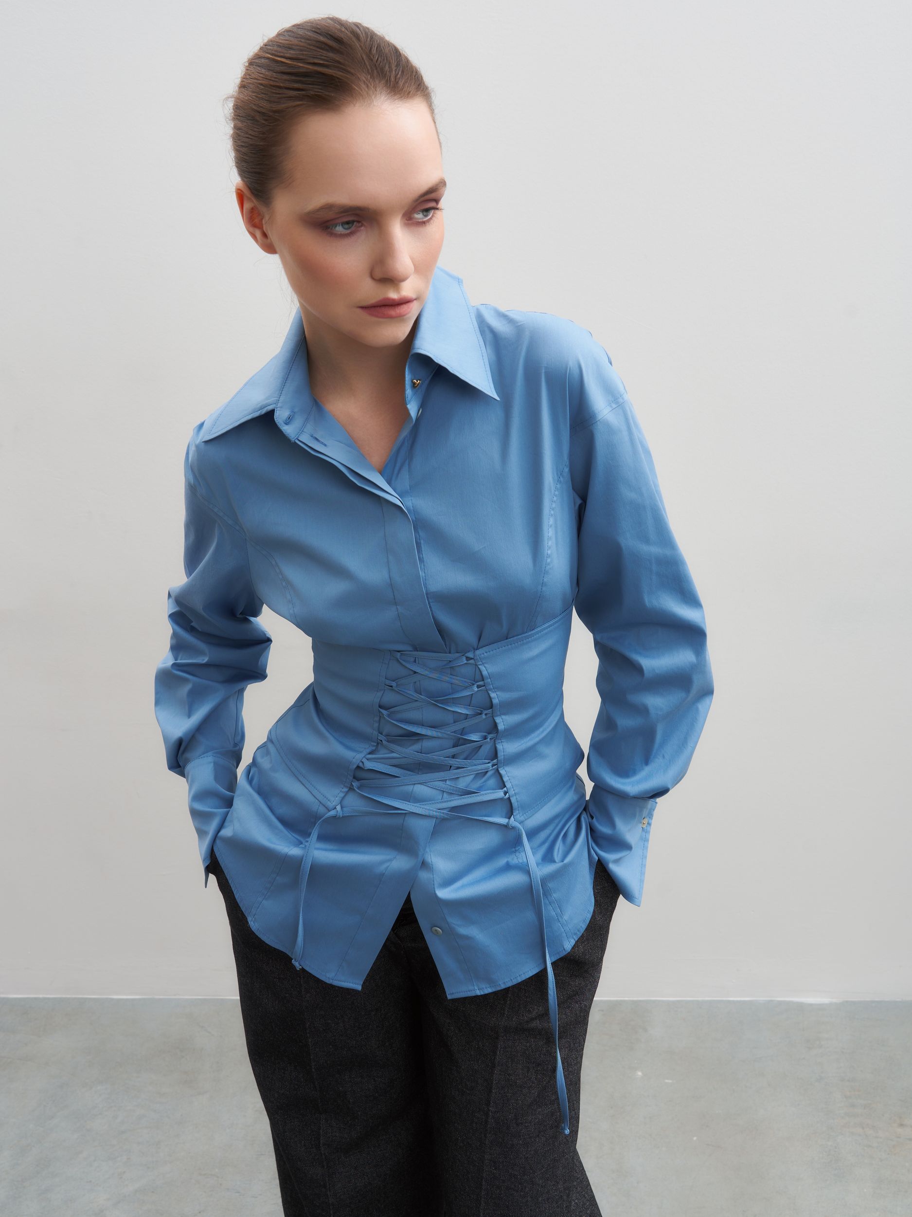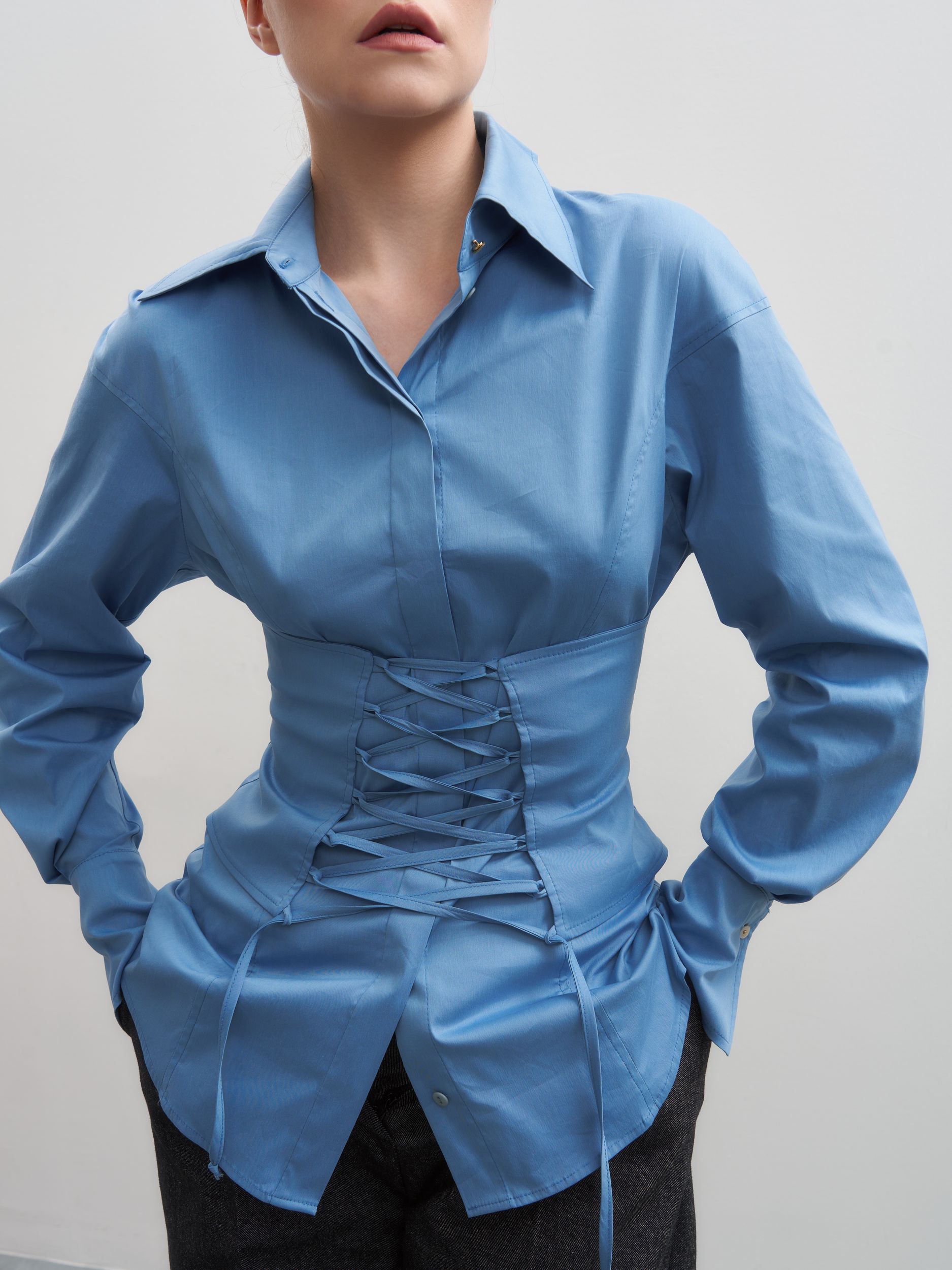 Модель выполнена из премиального итальянского хлопка. Мягко приспущенная линия плеча плавно переходит в вытачку, формируя элегантный силуэт. Главный акцент — корсет, который подчёркивает талию и позволяет менять посадку: его можно расположить как спереди, так и сзади, создавая два разных настроения образа.