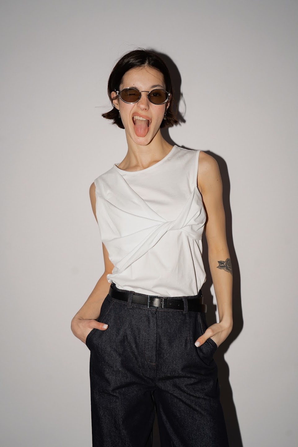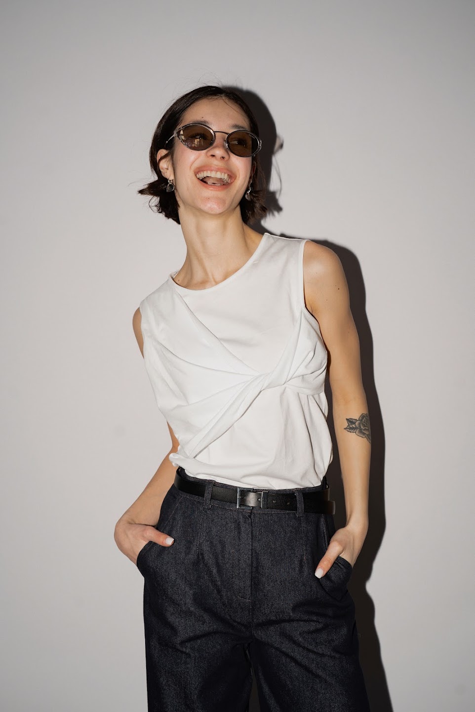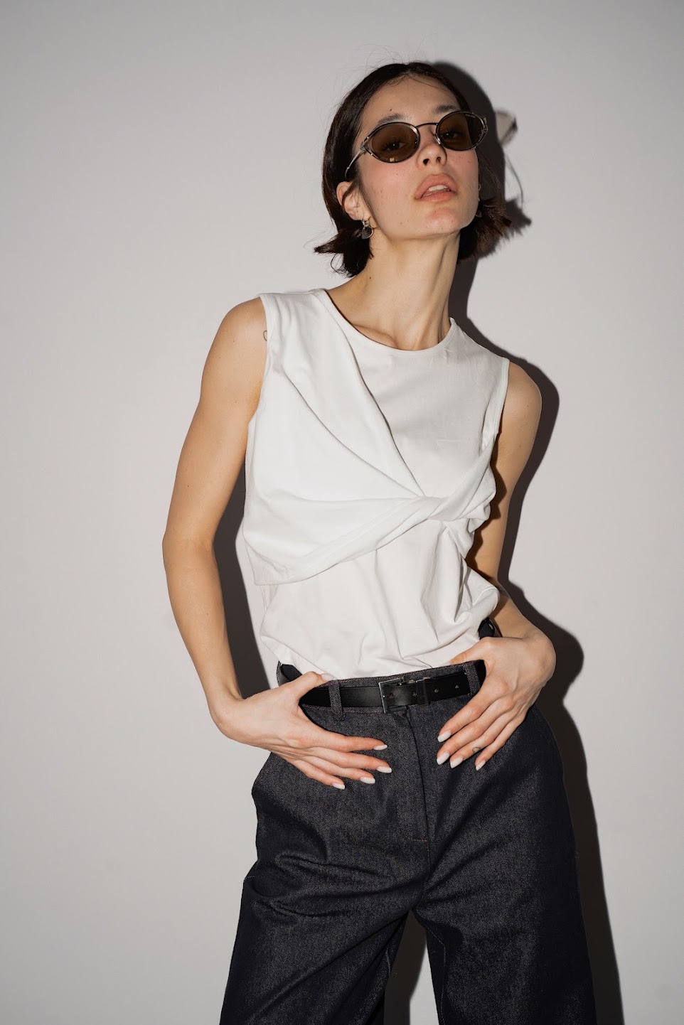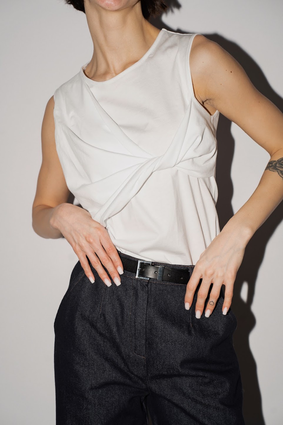 Топ из форменного итальянского хлопка, декорированного драпировкой лифа с перекрутом