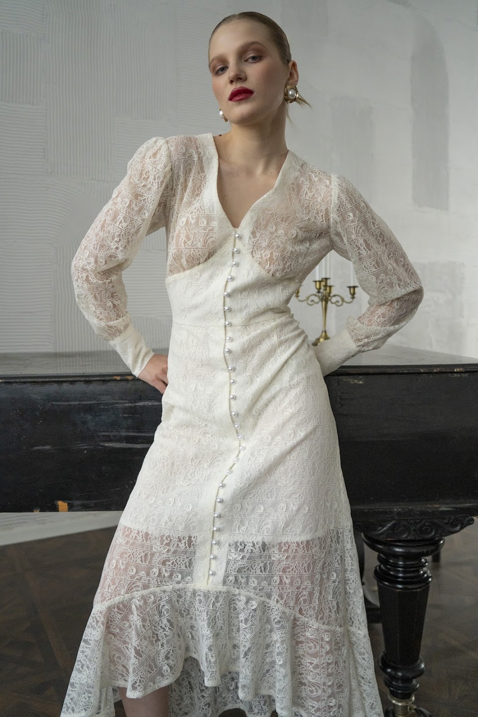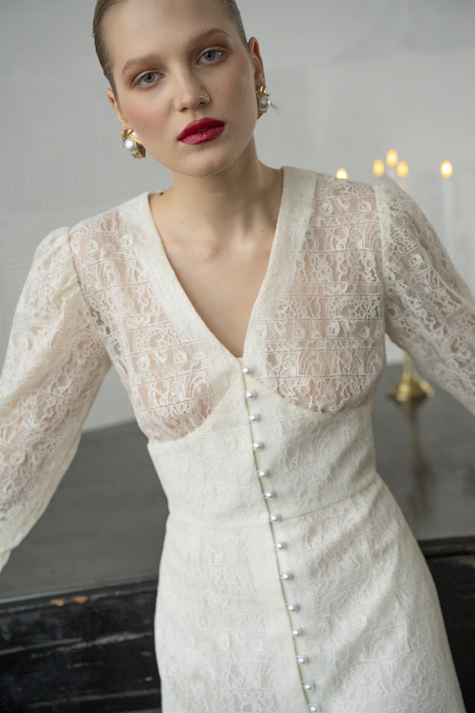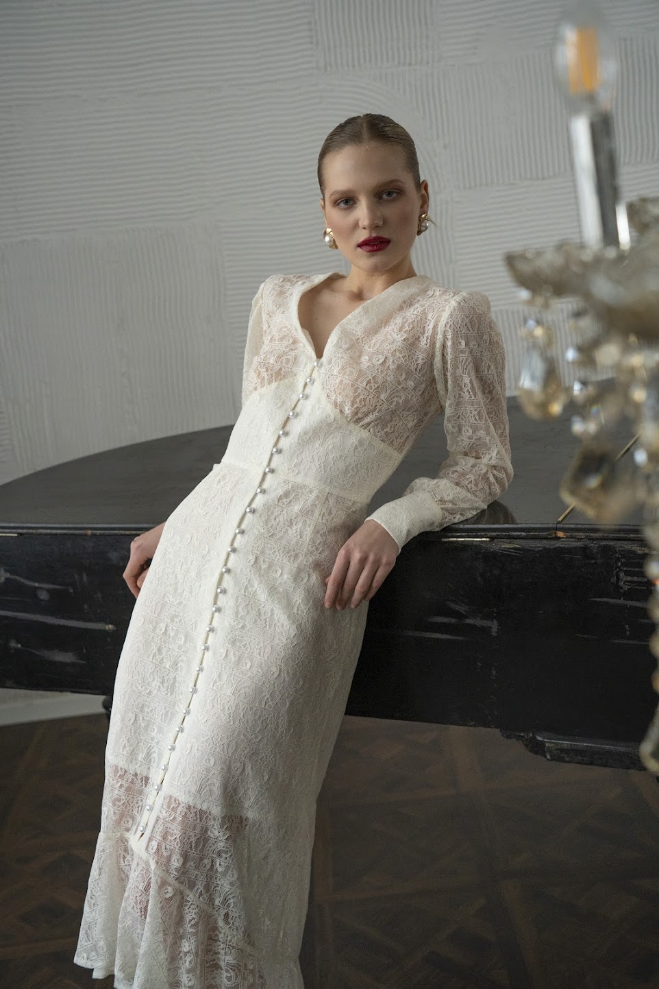 Благородное итальянское кружево расскрывается в безупречном классическом силуэте с корсетным лифом и акцентными высокими манжетами, декорированными десятками жемчужин.