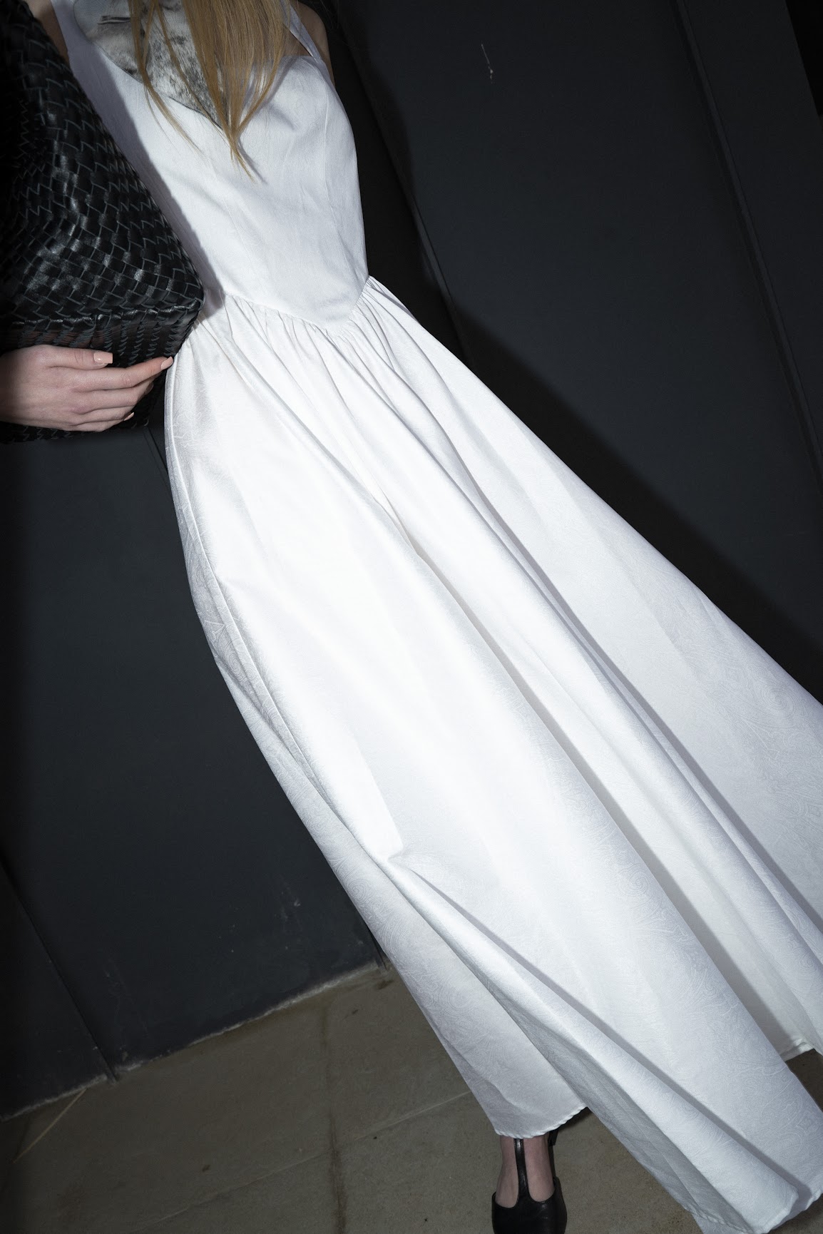 Скульптурный корсетный лиф, пышная юбка в сборку в трех вариациях длины, итальянский белоснежный хлопок с мерцающим эффектом шелкографии рисунка.