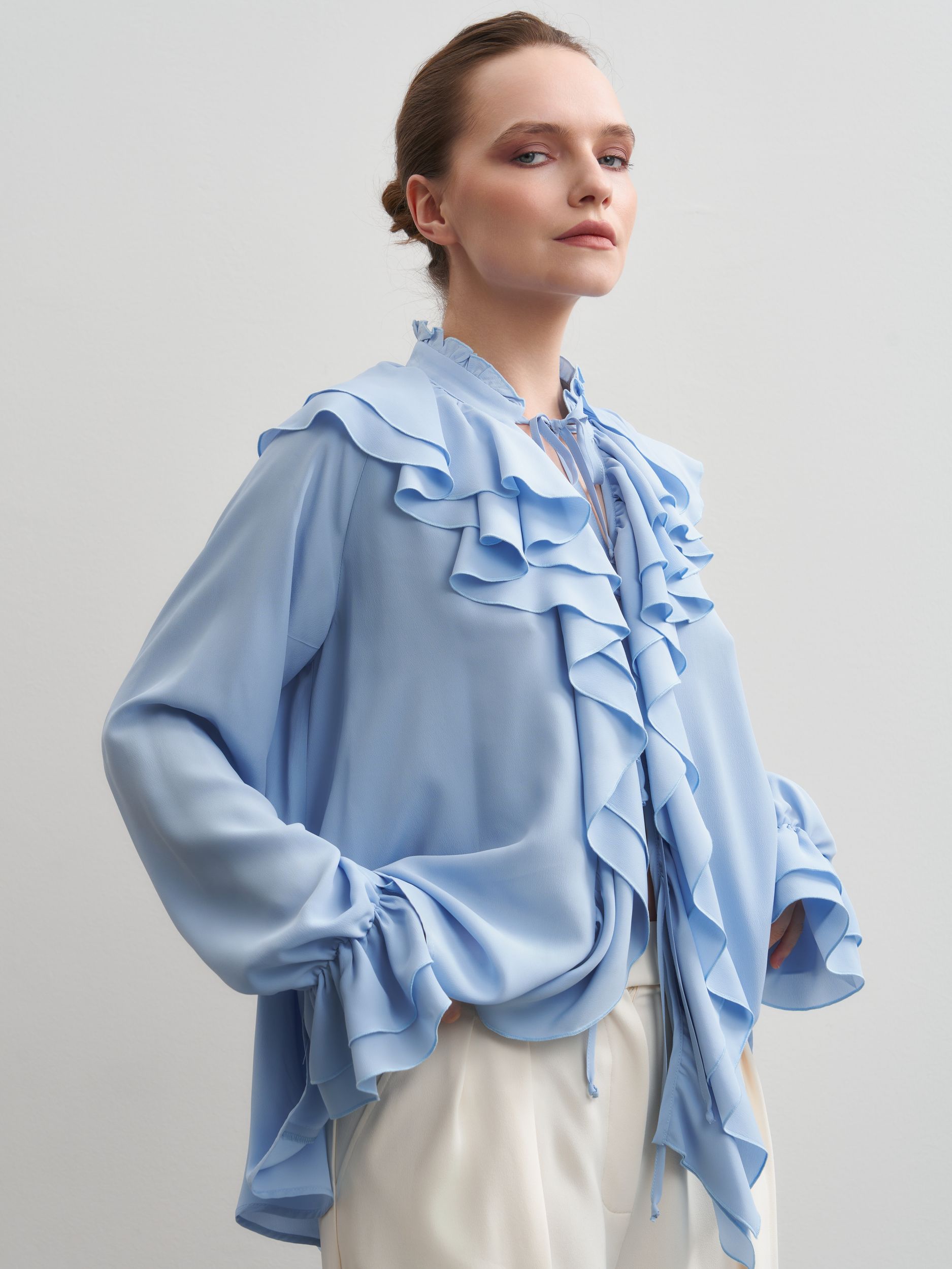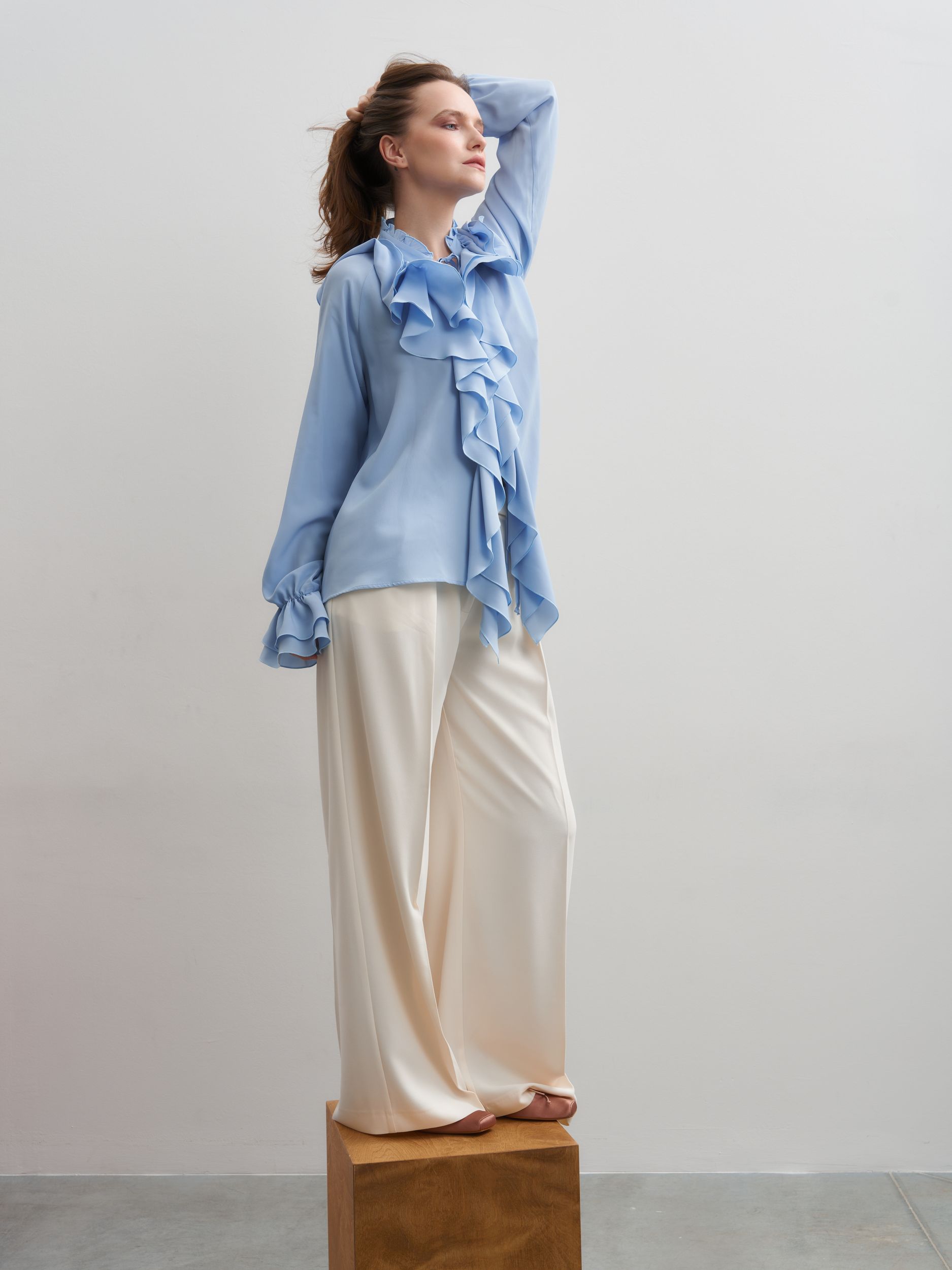 Изделие выполнено из натурального итальянского шёлка с добавлением ацетата — ткань мягко струится, приятно ощущается на коже и красиво держит форму. Свободный силуэт дополняют изящные рюши, которые придают образу воздушность, лёгкость и тонкую романтичность.
