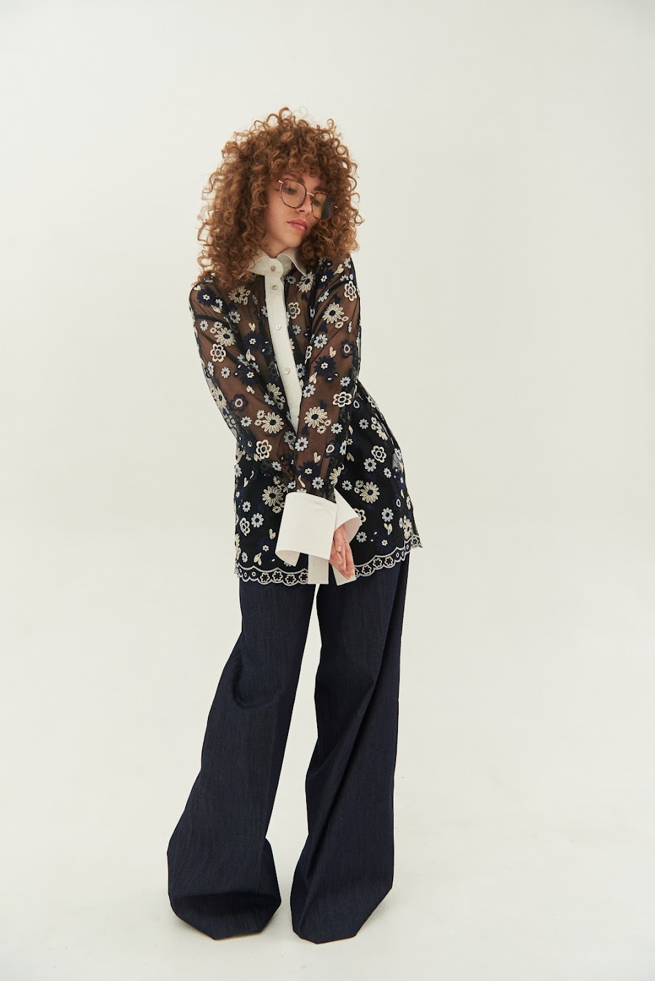 Рубашка свободного силуэта из эксклюзивного итальянского кружева с контрастными белыми манжетами и воротником .