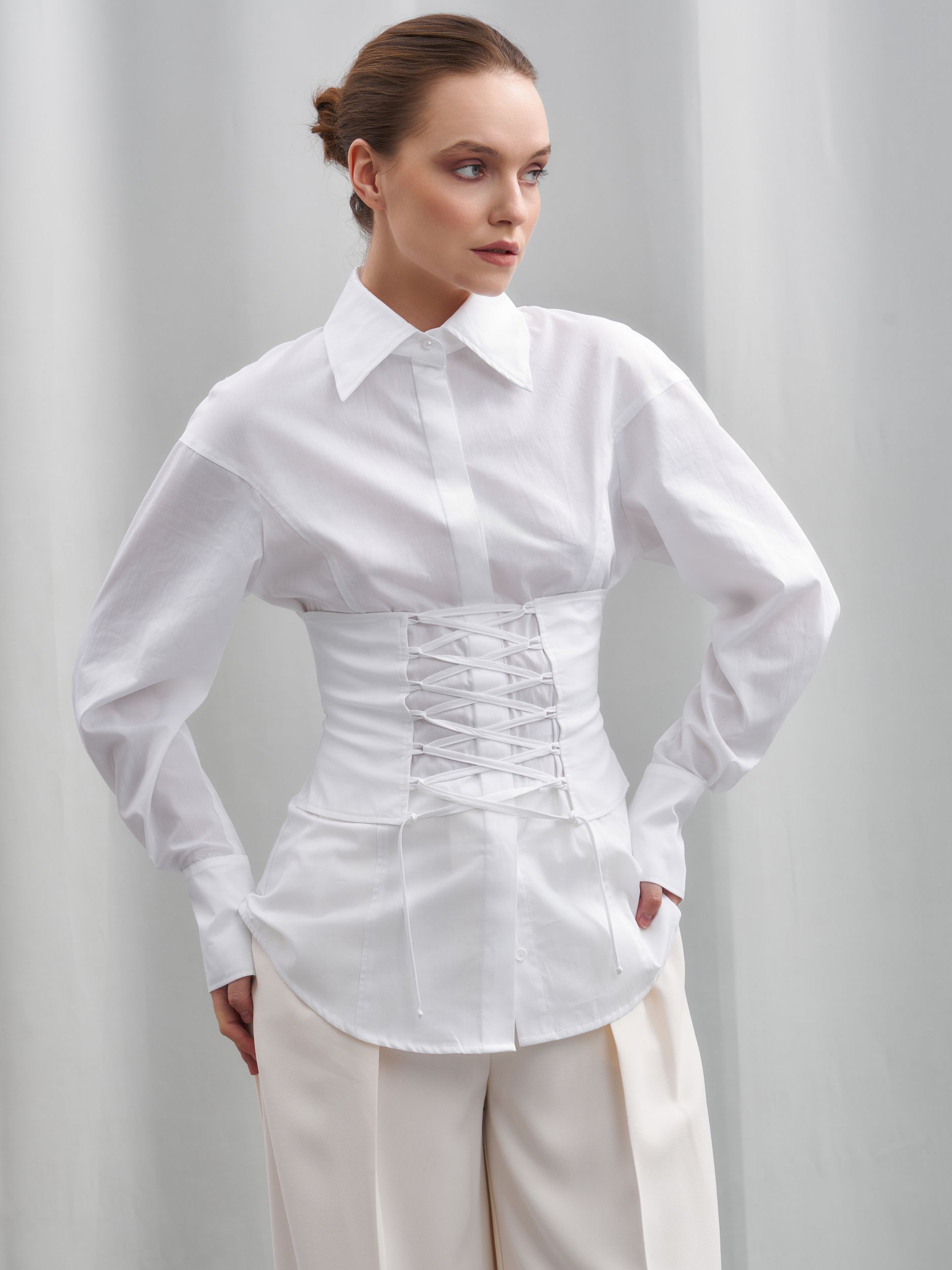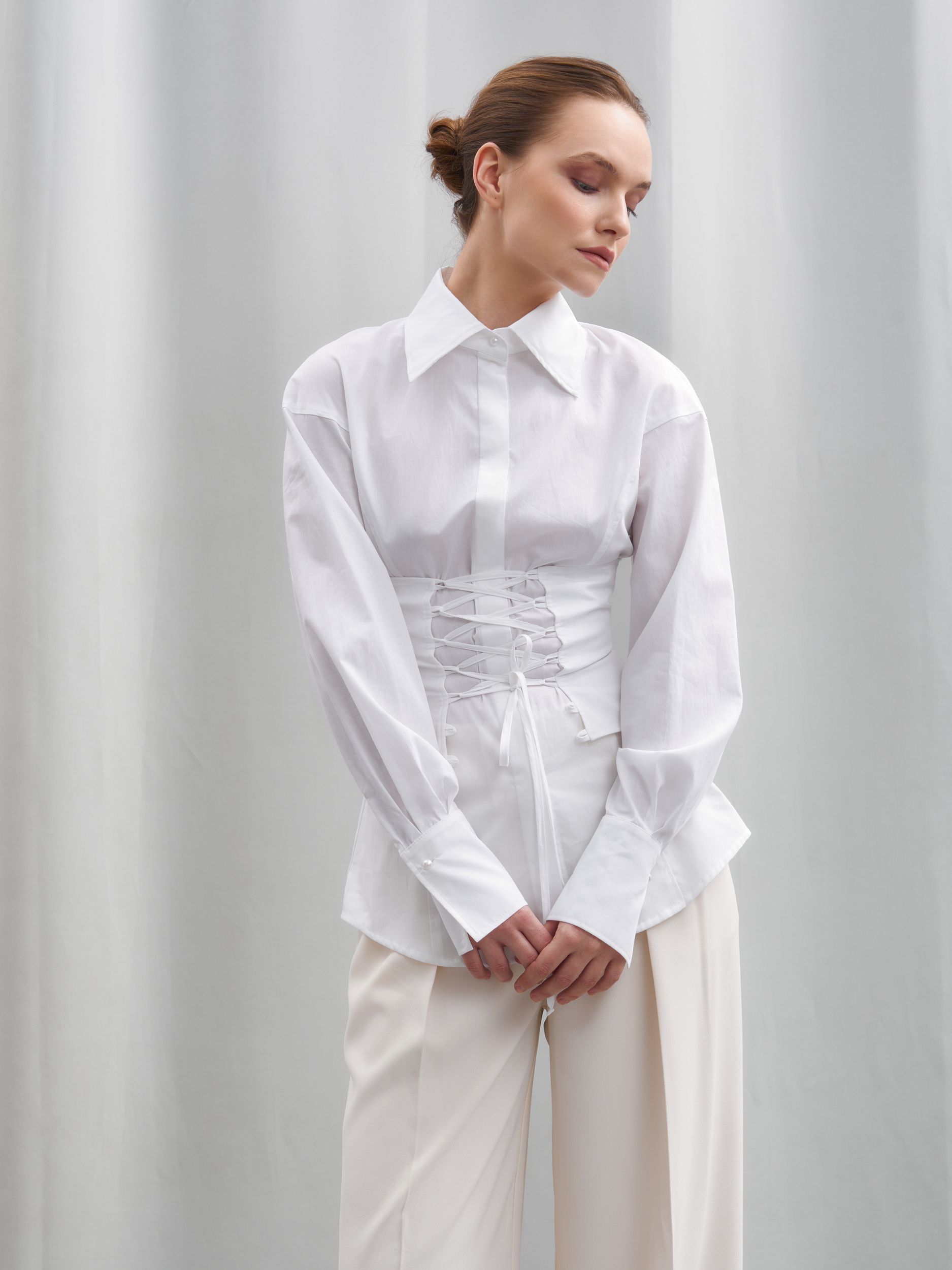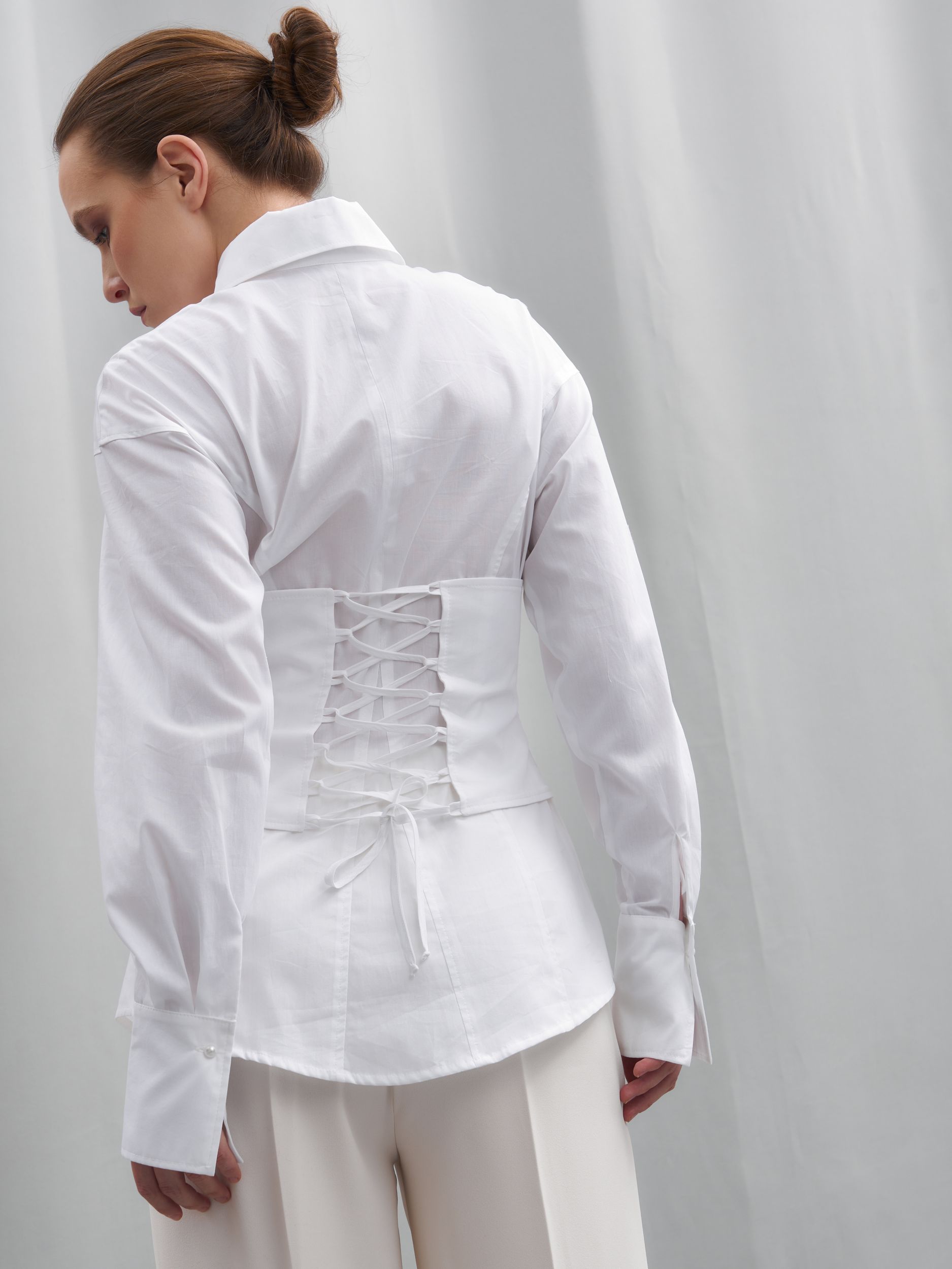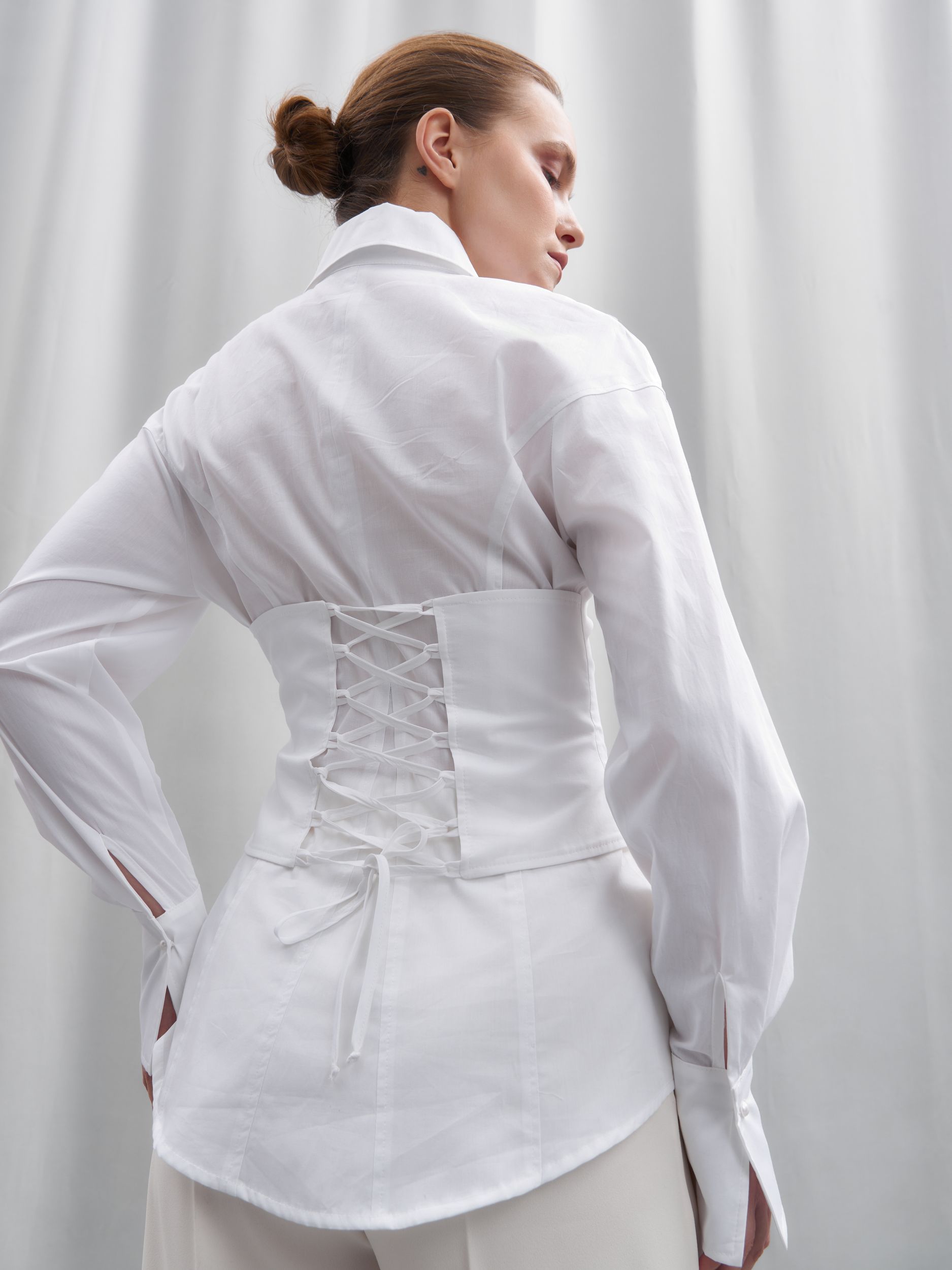 Модель выполнена из премиального итальянского хлопка. Мягко приспущенная линия плеча плавно переходит в вытачку, формируя элегантный силуэт. Главный акцент — корсет, который подчёркивает талию и позволяет менять посадку: его можно расположить как спереди, так и сзади, создавая два разных настроения образа.